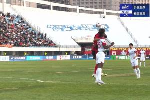 比赛补时阶段,亚泰禁区内奥斯卡和海米提争顶,球被海米提顶出底线,裁判判给亚泰球门球,玉昆球员均上前表示疑问。